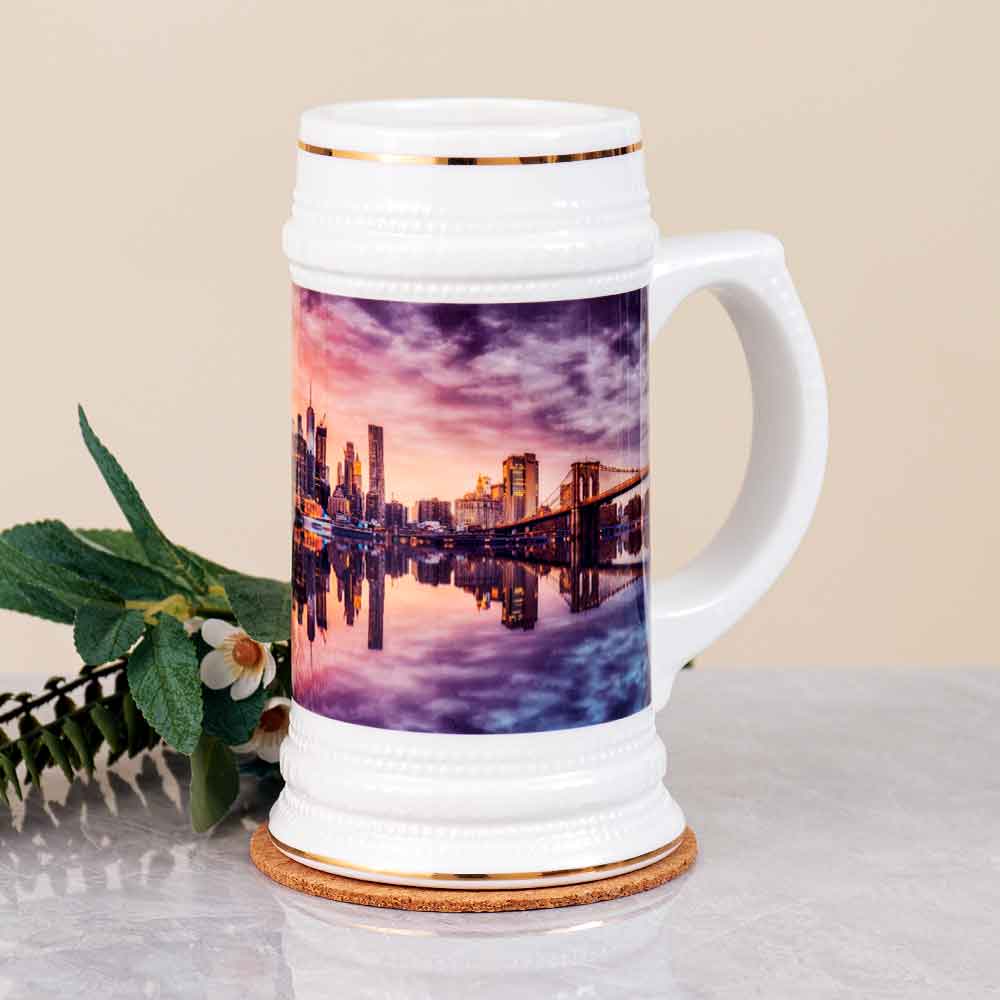 Egyedi grafikával kérhető fényképes kerámia sörös korsó aranyozott díszekkel